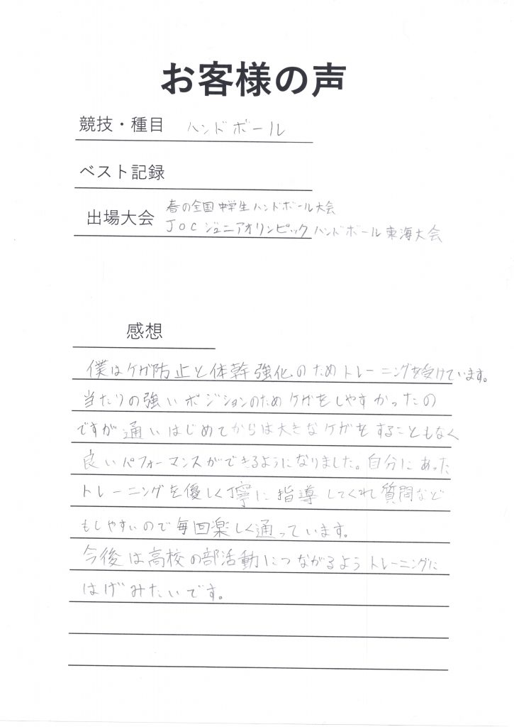 今回は、運動神経抜群のハンドボールアスリートとして活躍している学生のお客様をご紹介します。このお客様は、まだ学生ながらも、大人顔負けのハードなトレーニングを日々こなし、フィジカル、アジリティ、クイックネスといった運動能力のすべてにおいて大きな成長を遂げました。ジムに通い始めた当初よりも、その能力は飛躍的に向上し、今では抜群のフィジカルを持つアスリートへと成長しています。