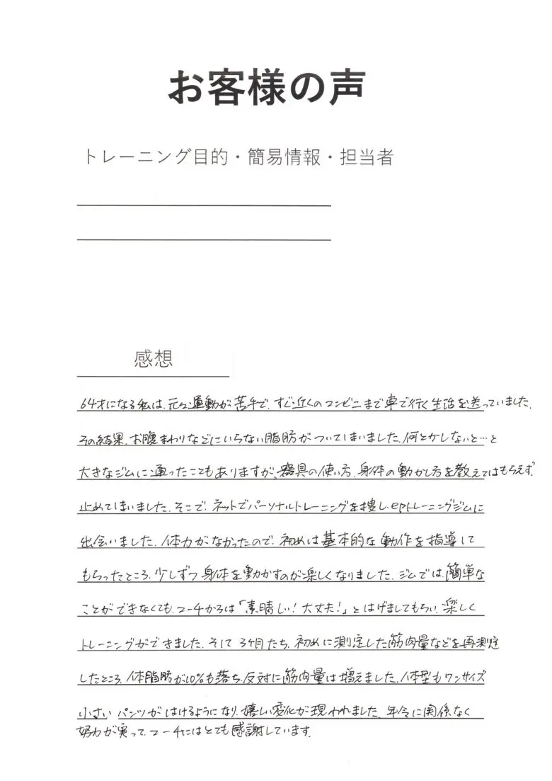 女性:60代 会員様の声2021.02.17会員様の声 Post Share LINE note 女性:60代 会員様の声女性:60代 目的:体力UP・シェイプアップトレーニング内容&スタッフの感想: 初めて来館した時に、体力と筋力が低下し動くことが苦手な感じがしました。その影響で、何をするにも億劫になっていたと感じます。 スクワットを行う際も、重りを持つことが出来ず、重りを持たない状態から筋肉を動かす事から始めました。 そんな状況から徐々に負荷を加え、筋肉に刺激を与えトレーニングを重ねた結果・・・今では20kgのバーベルを担ぎ、さらに重さもプラスしスクワットを行っています‼ 一歩一歩の積み重ねた結果、体も動きやすく、体力も付き体も引き締まってきました。 まだまだここからがスタートラインです♪トレーニングは大変かと思いますが、その先には豊かな人生が待っているかと思います♪諦めず、これからも頑張りましょう‼ Post Share LINE note 女性:キッズ 会員様の声 前の記事 60代女性:体重以上のデットリフトトレーニング♪ 次の記事