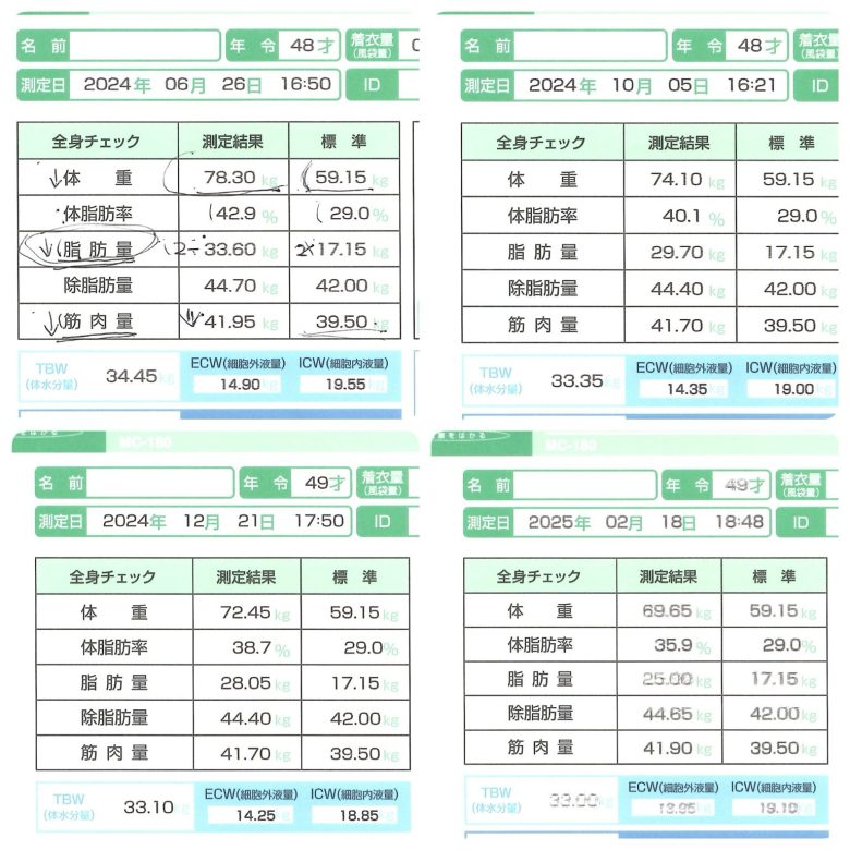 体重だけでなく、体脂肪量・筋肉量の変化も確認しながら進めます。